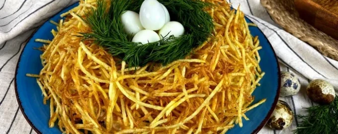 - Au lieu de pommes de terre frites, vous pouvez décorer le plat avec du fromage. Râpez 300 g de fromage sur une râpe à gros grains et saupoudrez-en la salade « Nest ».