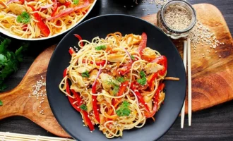 - Pendant ce temps, préparer une poêle : hacher l’oignon et râper les carottes. Faire revenir 2-3 minutes dans une poêle chaude avec de l’huile. Couper les champignons en lamelles et les ajouter aux légumes. Faire revenir le tout pendant 5 minutes. Verser ensuite un peu de bouillon de la poêle, laisser mijoter encore 2 minutes et éteindre.